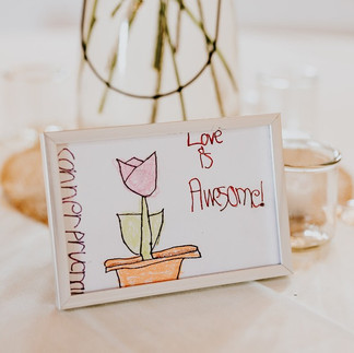 Killian is a teacher and had her students help make their wedding decor. She framed their artwork about love and used it as table centerpieces for the reception.